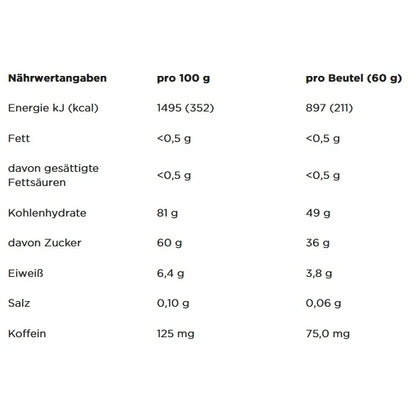 - wie auch die PowerGele® enthalten sie C2MAX, eine wissenschaftlich entwickelte Kombination aus Kohlenhydraten mit einem 2:1 Verhältnis von Glukose- und Fruktosequellen