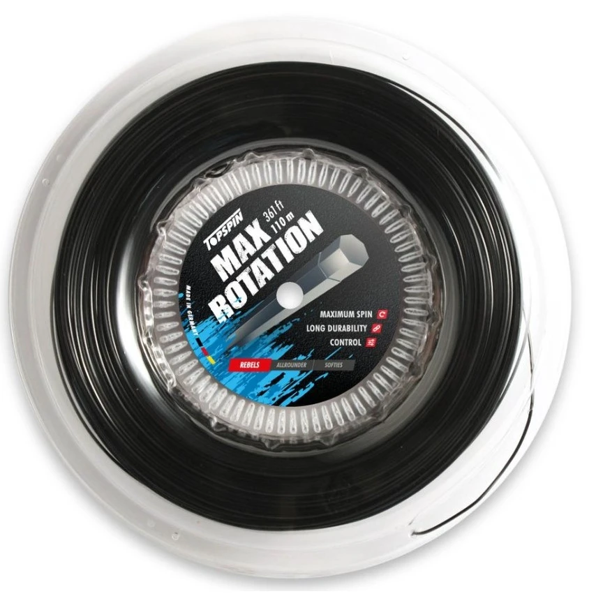 - die Topspin Cyber Max Rotation ist eine Co-Polyestersaite mit heptagonalem (siebeneckigem) Profil