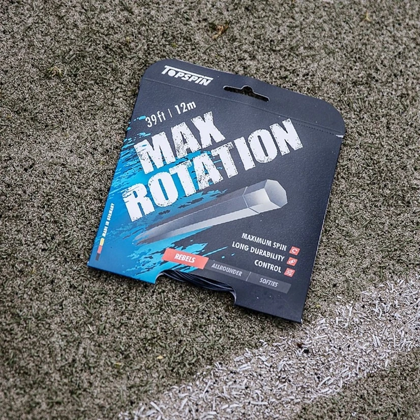 - die Topspin Cyber Max Rotation ist eine Co-Polyestersaite mit heptagonalem (siebeneckigem) Profil